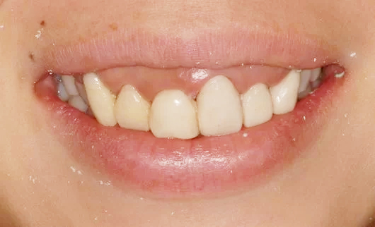右の画像は、ガミースマイルの改善を目的に当院にご来院頂いた患者さんの写真です。向かって左の前歯のほうが右の前歯よりも生え始める位置が低く、歯茎が目立って見えます。